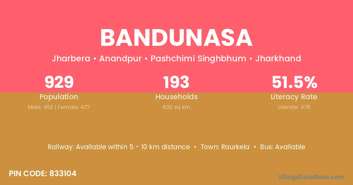 Bandunasa village has a total population of 929 people, of which 452 are males and 477 are females.