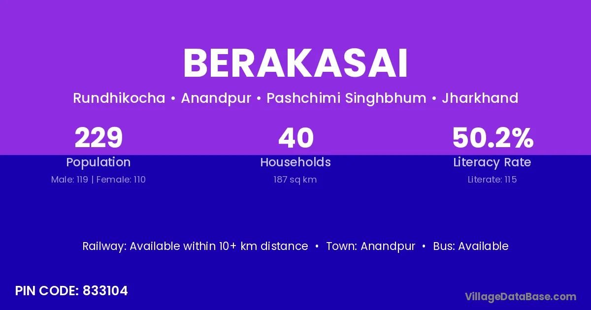 The literacy rate of Berakasai village is 50.22%. Male literacy stands at 57.98% and female literacy at 41.82%.