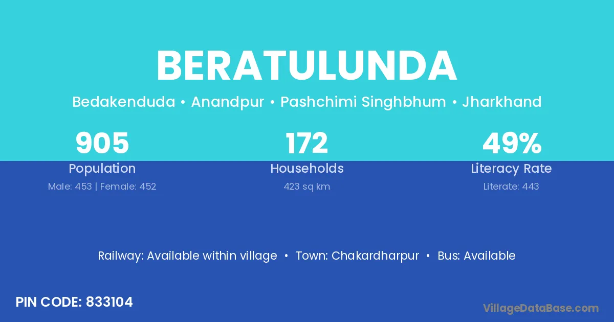 Chakardharpur is the nearest town to Beratulunda village for major economic activities