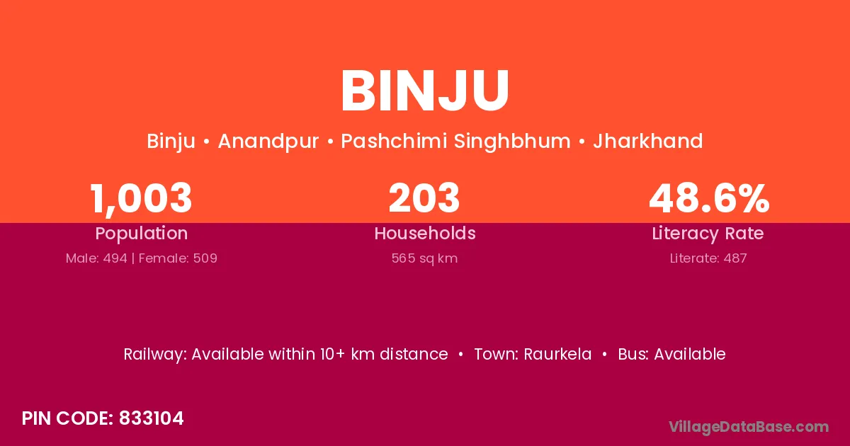Binju village has a total population of 1,003 people, of which 494 are males and 509 are females.