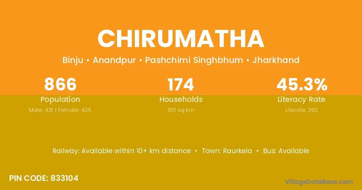 According to Census 2011 information, the village code of Chirumatha village is 833104.