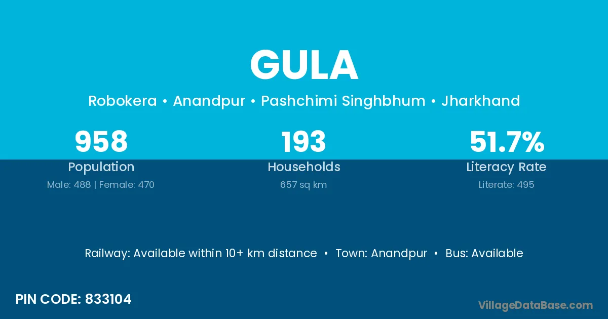 According to Census 2011 information, the village code of Gula village is 833104.