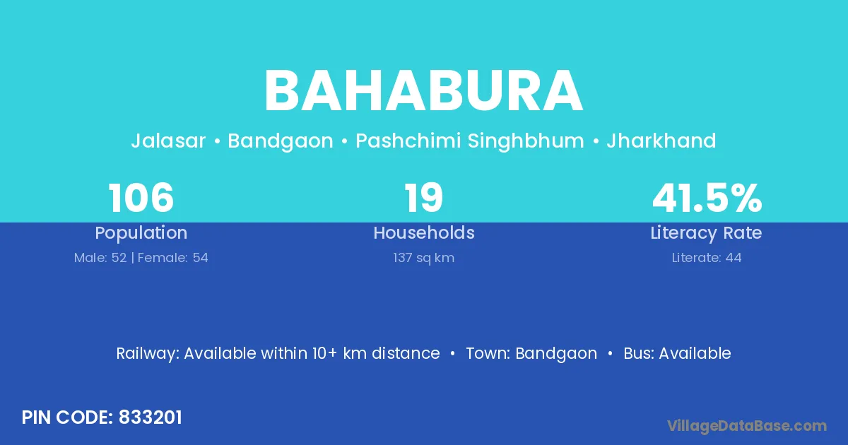 Bahabura village has a total population of 106 people, of which 52 are males and 54 are females.