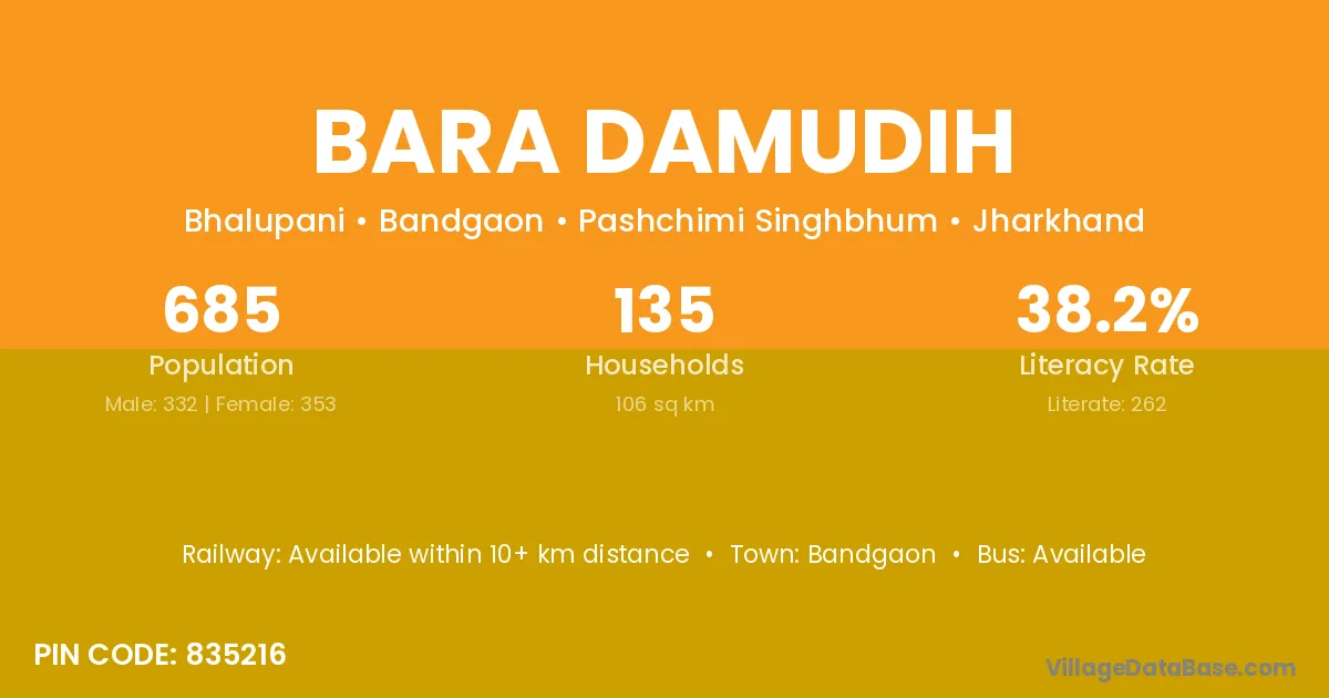 Bara Damudih village has a total population of 685 people, of which 332 are males and 353 are females.