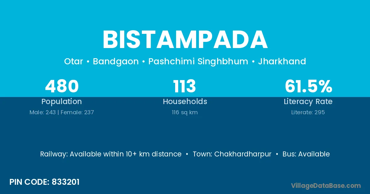 Bistampada village has a total population of 480 people, of which 243 are males and 237 are females.