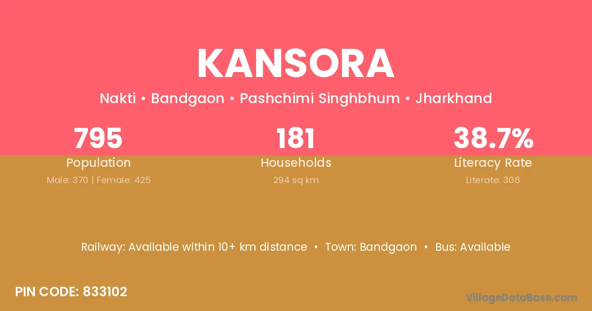 According to Census 2011 information, the village code of Kansora village is 833102.