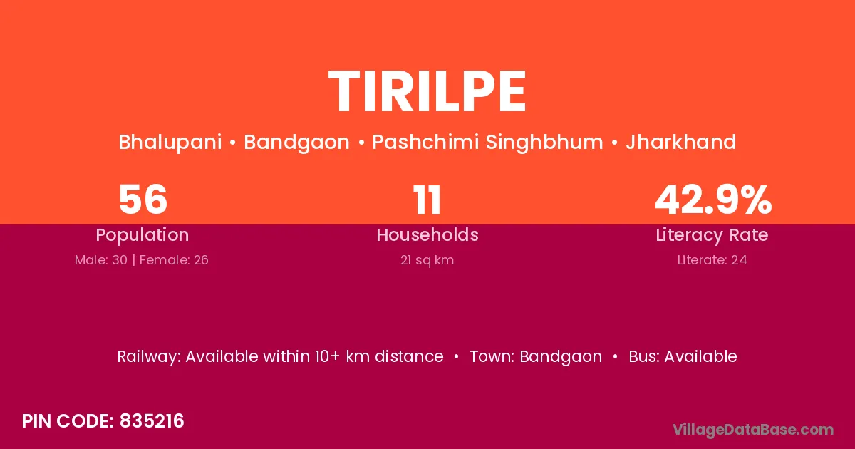 Tirilpe village has a total population of 56 people, of which 30 are males and 26 are females.
