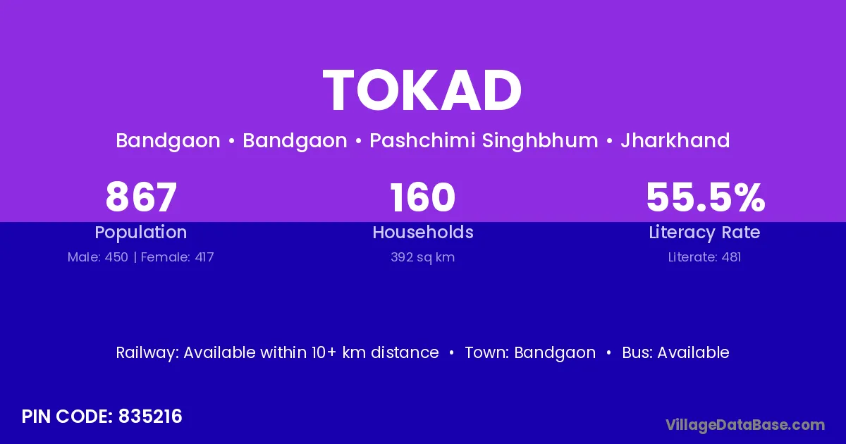 According to Census 2011 information, the village code of Tokad village is 835216.