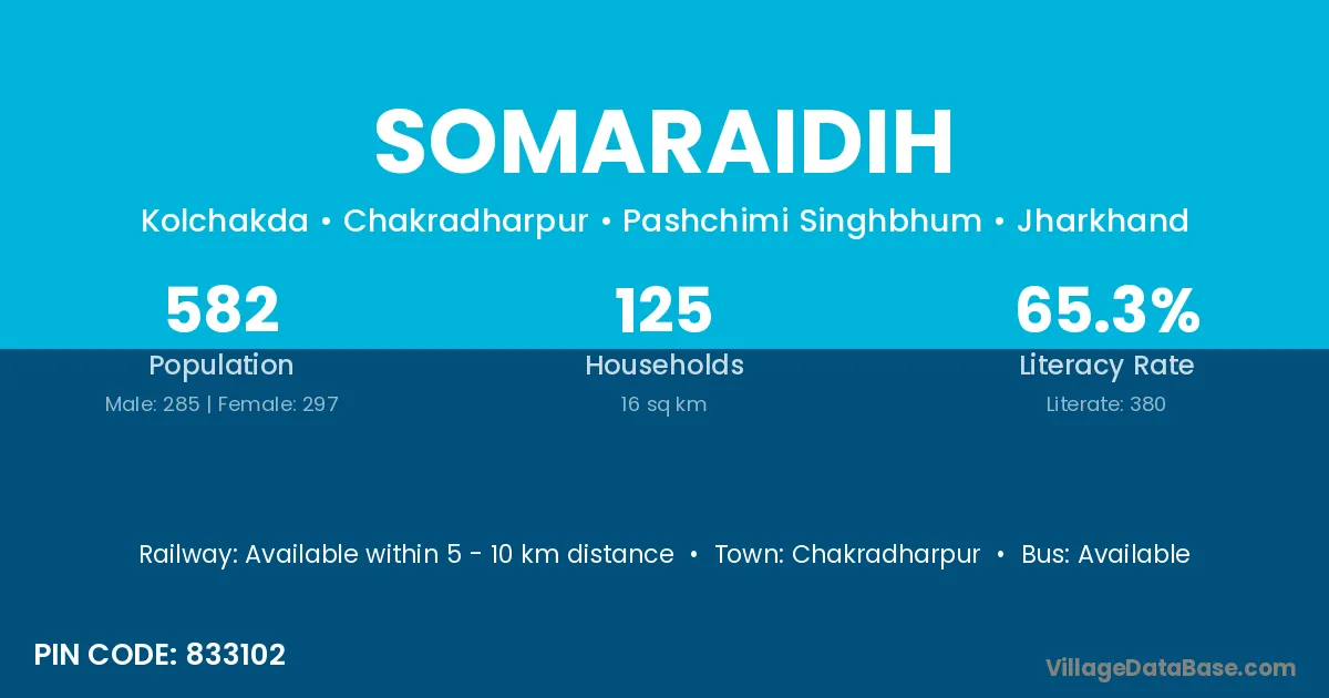 Somaraidih village has a total population of 582 people, of which 285 are males and 297 are females.