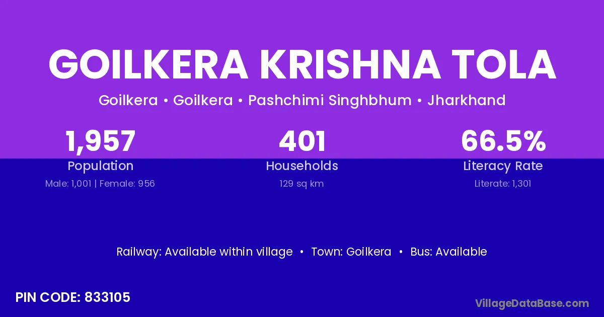 Goilkera Krishna Tola village has a total population of 1,957 people, of which 1,001 are males and 956 are females.