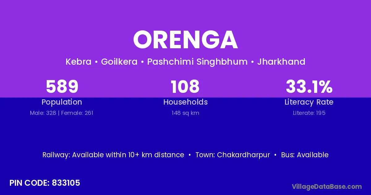 According to Census 2011 information, the village code of Orenga village is 833105.
