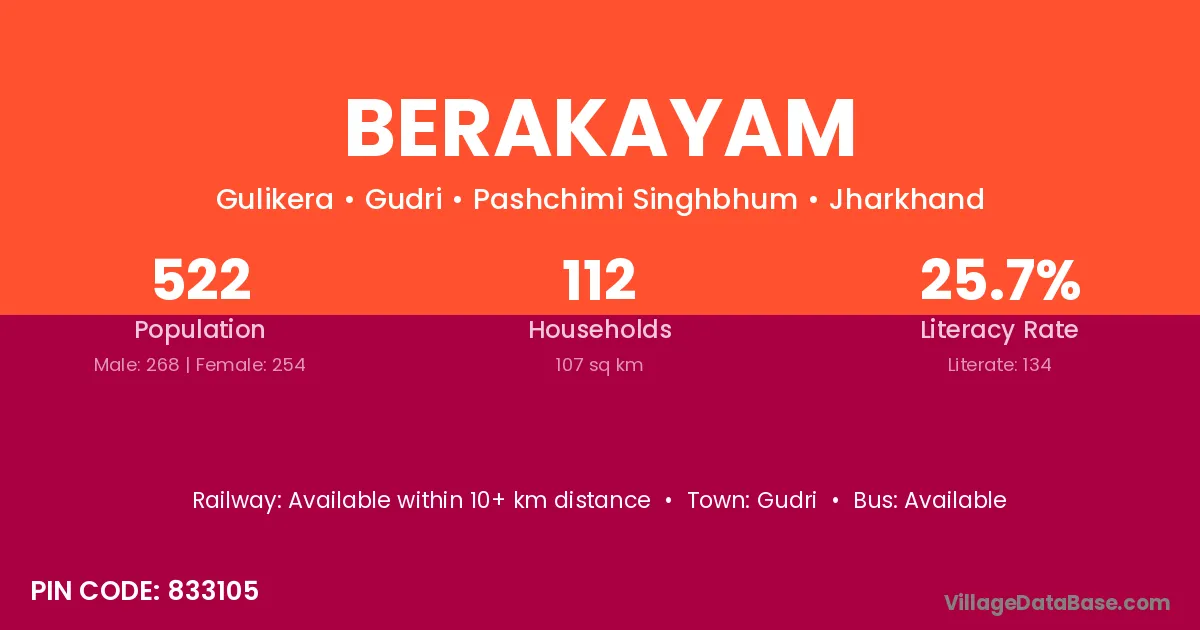 According to Census 2011 information, the village code of Berakayam village is 833105.