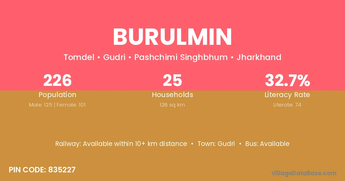 The literacy rate of Burulmin village is 32.74%. Male literacy stands at 44.00% and female literacy at 18.81%.