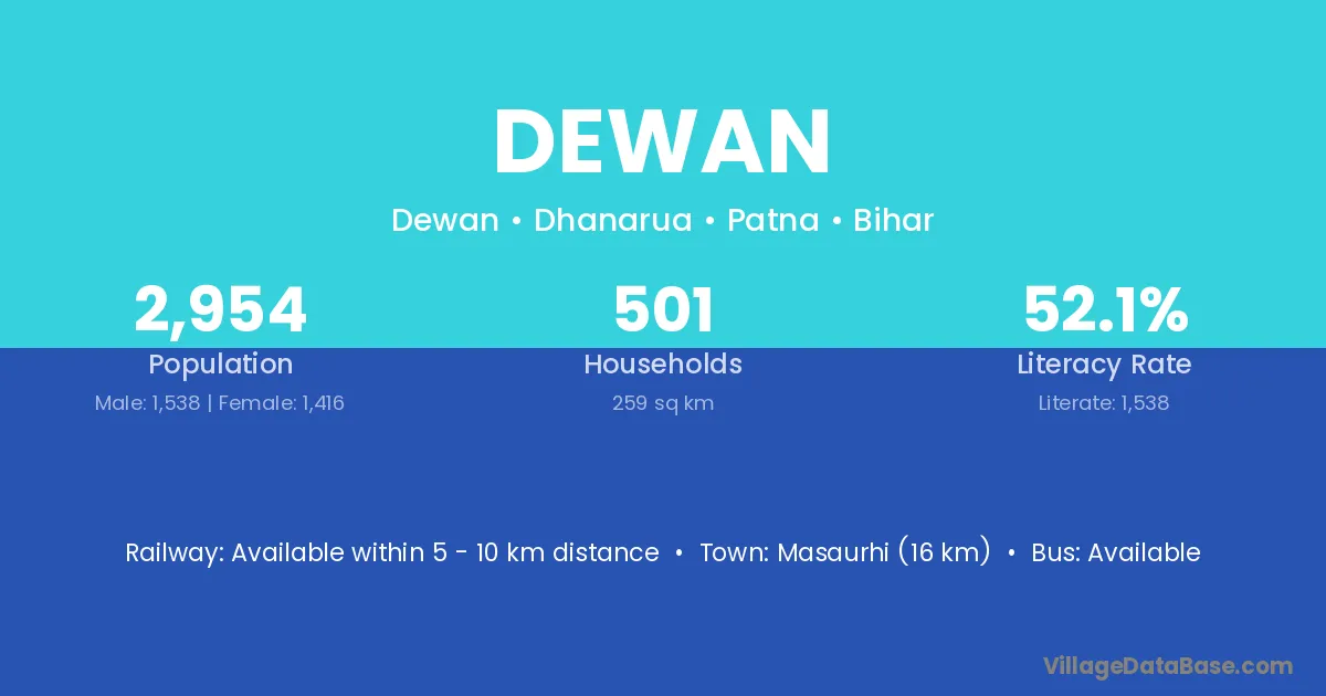 The literacy rate of Dewan village is 34.18%. Male literacy stands at 49.21% and female literacy at 19.24%.