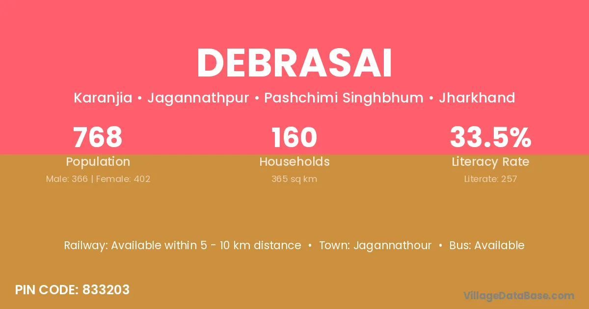Debrasai village has a total population of 768 people, of which 366 are males and 402 are females.