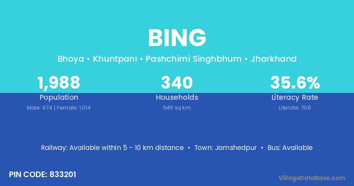 Jamshedpur is the nearest town to Bing village for major economic activities
