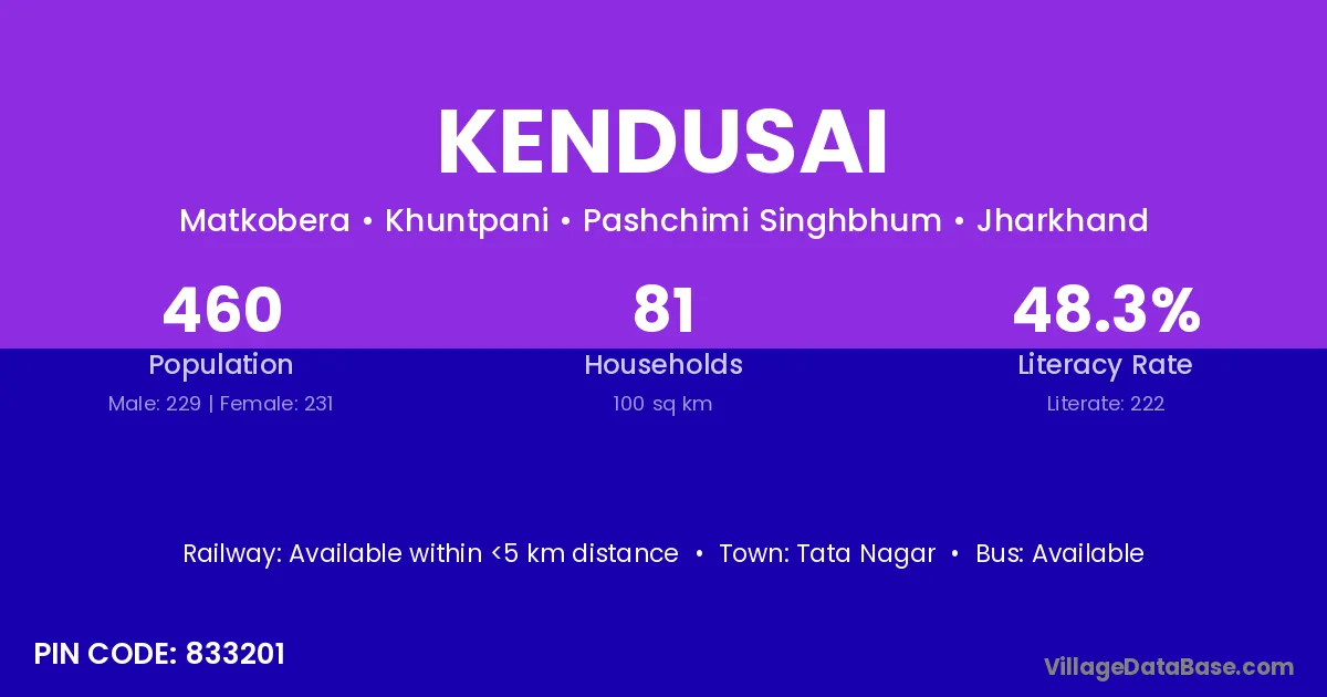 According to Census 2011 information, the village code of Kendusai village is 833201.