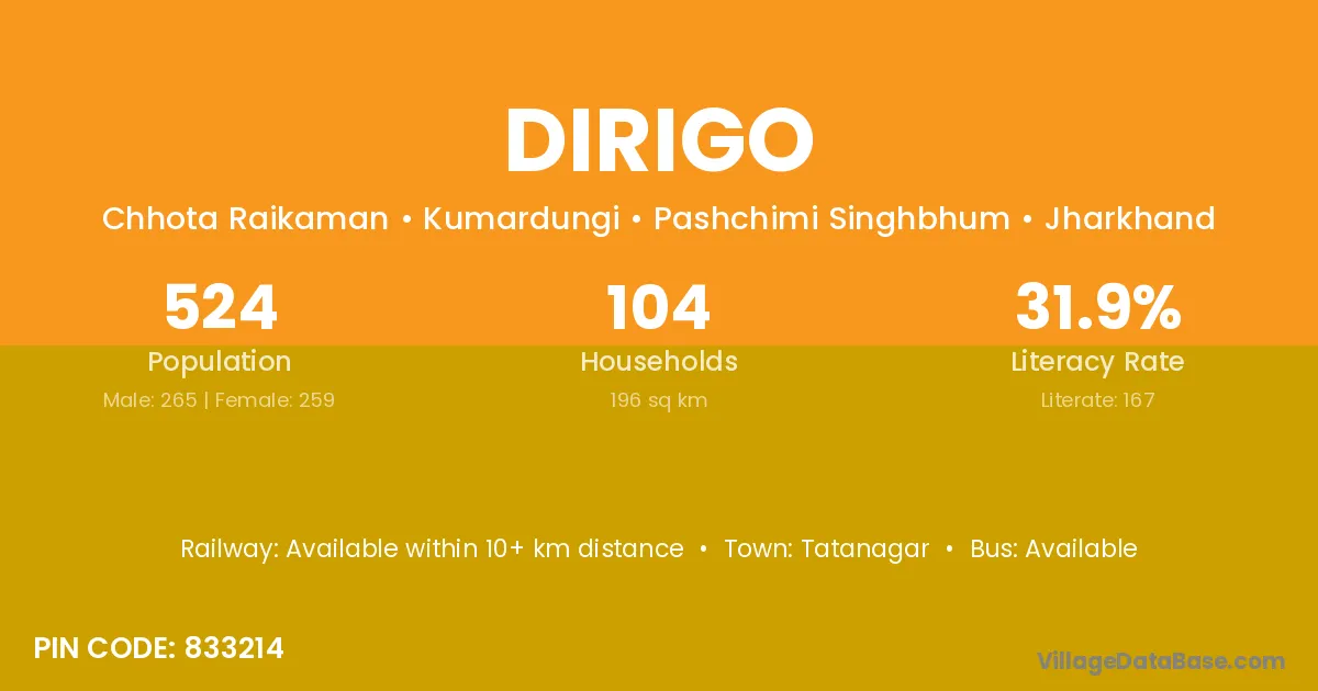 Tatanagar is the nearest town to Dirigo village for major economic activities