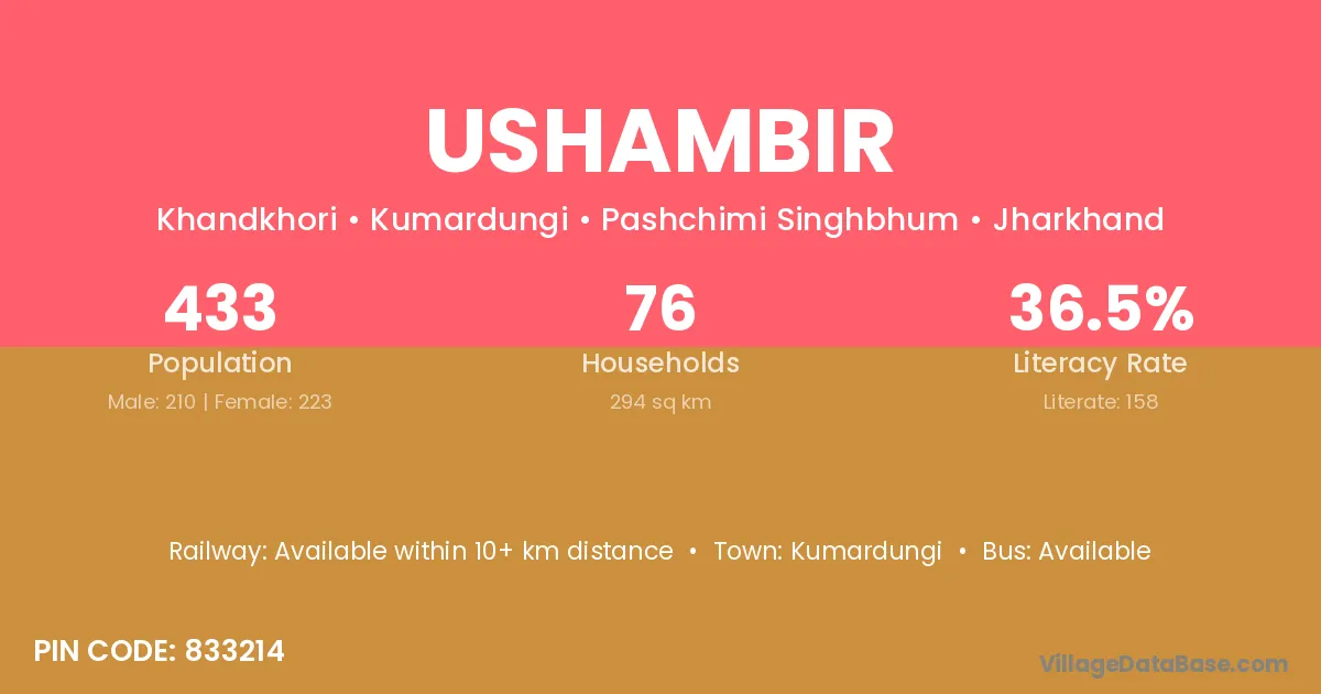 According to Census 2011 information, the village code of Ushambir village is 833214.