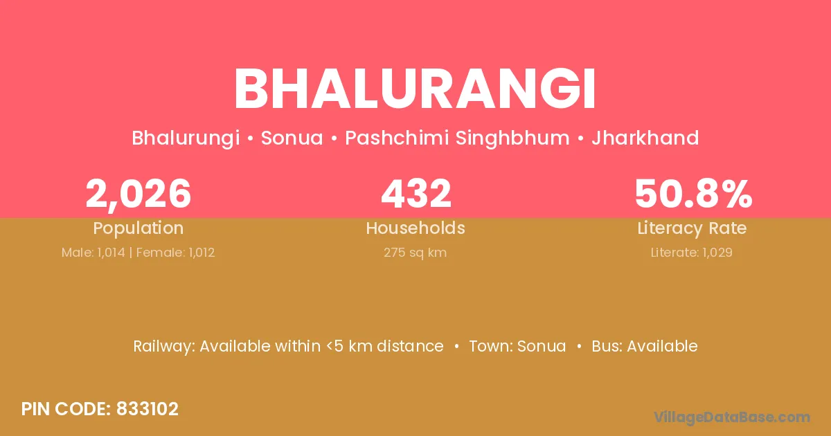 Bhalurangi village has a total population of 2,026 people, of which 1,014 are males and 1,012 are females.