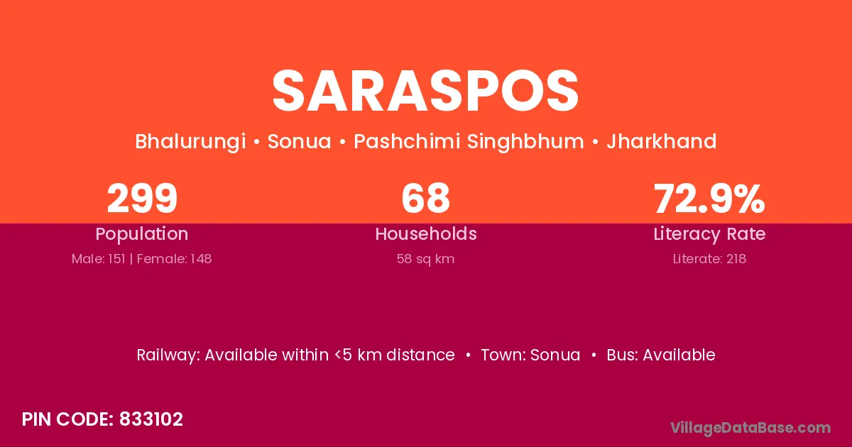 According to Census 2011 information, the village code of Saraspos village is 833102.