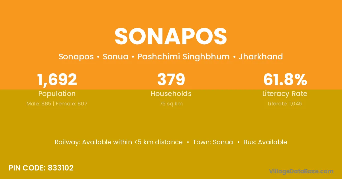 According to Census 2011 information, the village code of Sonapos village is 833102.
