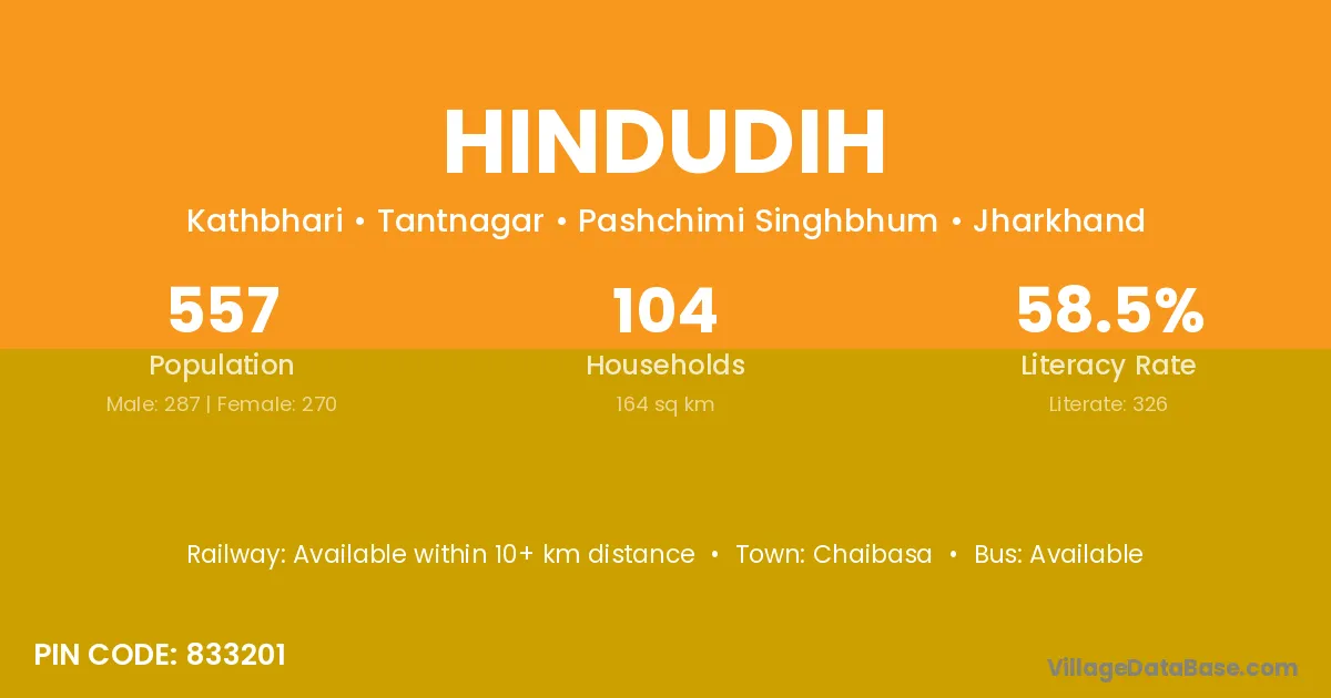 Hindudih village has a total population of 557 people, of which 287 are males and 270 are females.