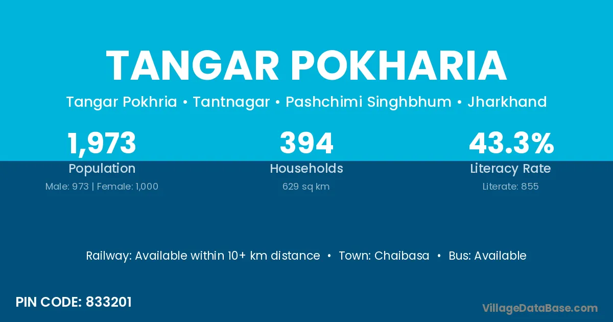 Tangar Pokharia village has a total population of 1,973 people, of which 973 are males and 1,000 are females.