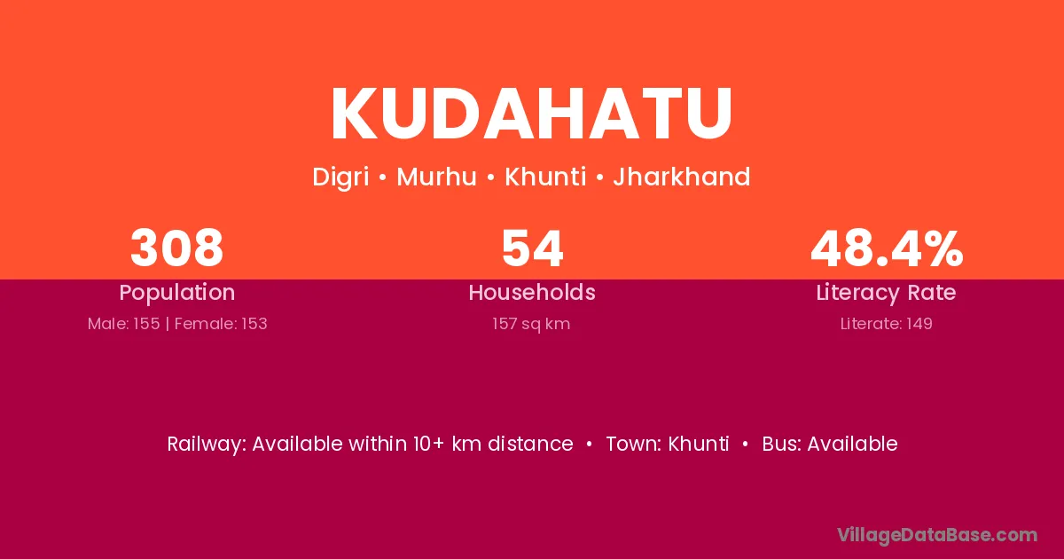 The literacy rate of Kudahatu village is 40.90%. Male literacy stands at 51.60% and female literacy at 30.37%.