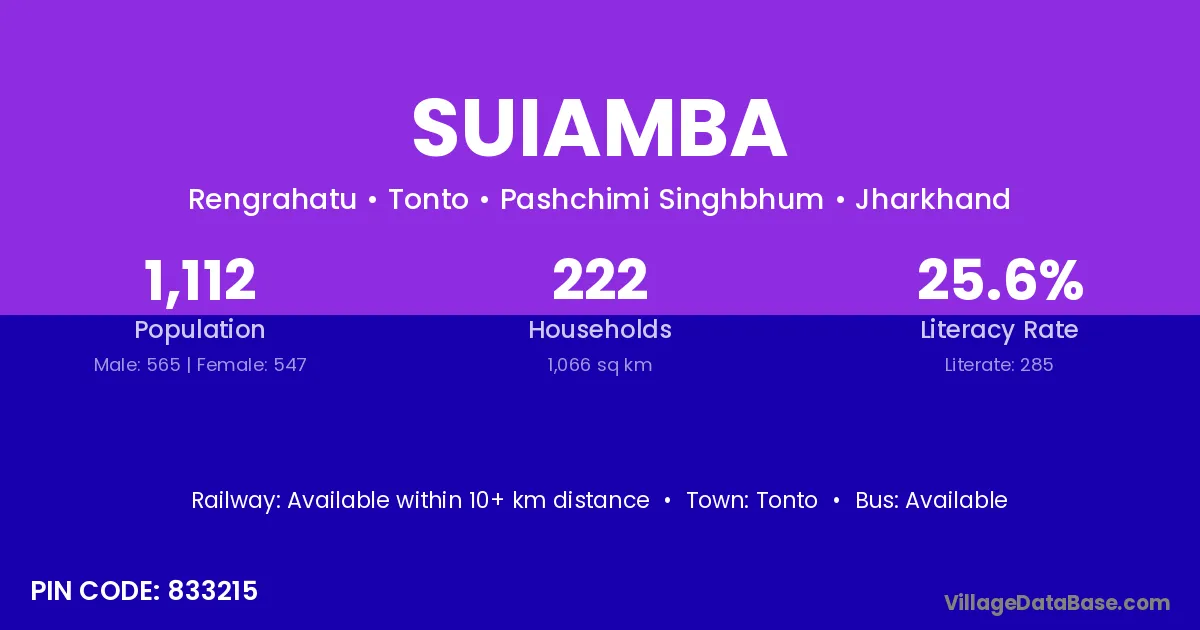 Suiamba village has a total population of 1,112 people, of which 565 are males and 547 are females.