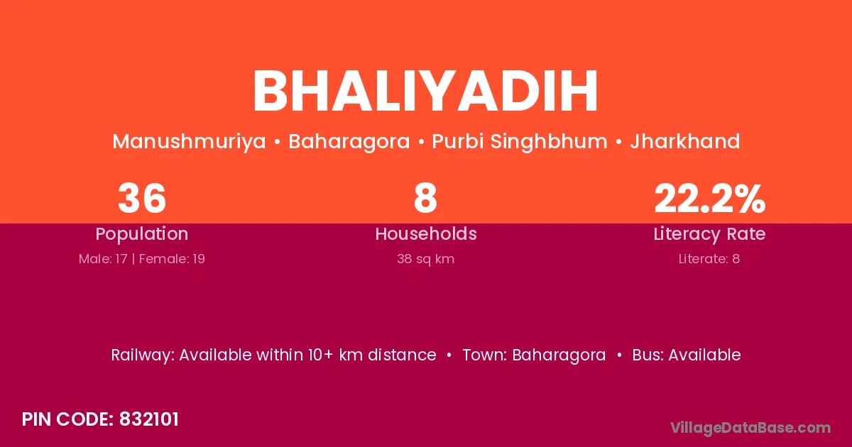 Bhaliyadih village has a total population of 36 people, of which 17 are males and 19 are females.