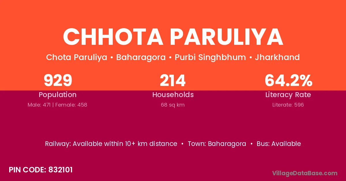 Chhota Paruliya village has a total population of 929 people, of which 471 are males and 458 are females.