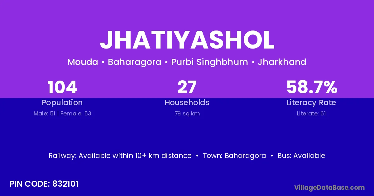 Jhatiyashol village has a total population of 104 people, of which 51 are males and 53 are females.