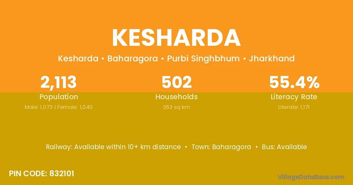 Kesharda village has a total population of 2,113 people, of which 1,073 are males and 1,040 are females.