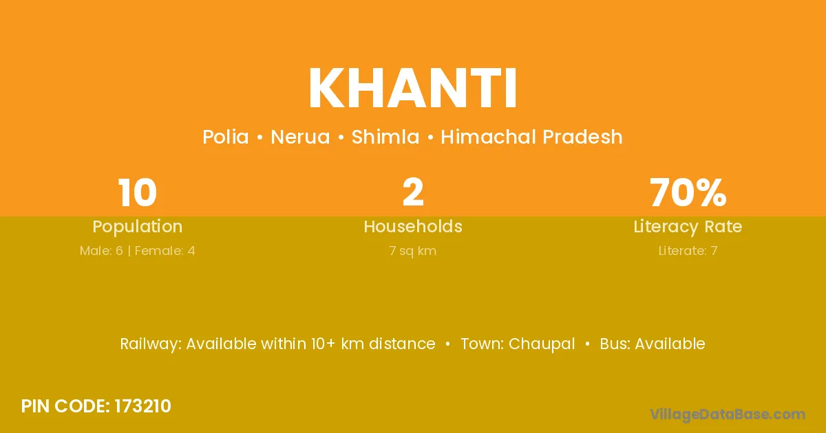 The literacy rate of Khanti village is 33.96%. Male literacy stands at 41.12% and female literacy at 26.67%.