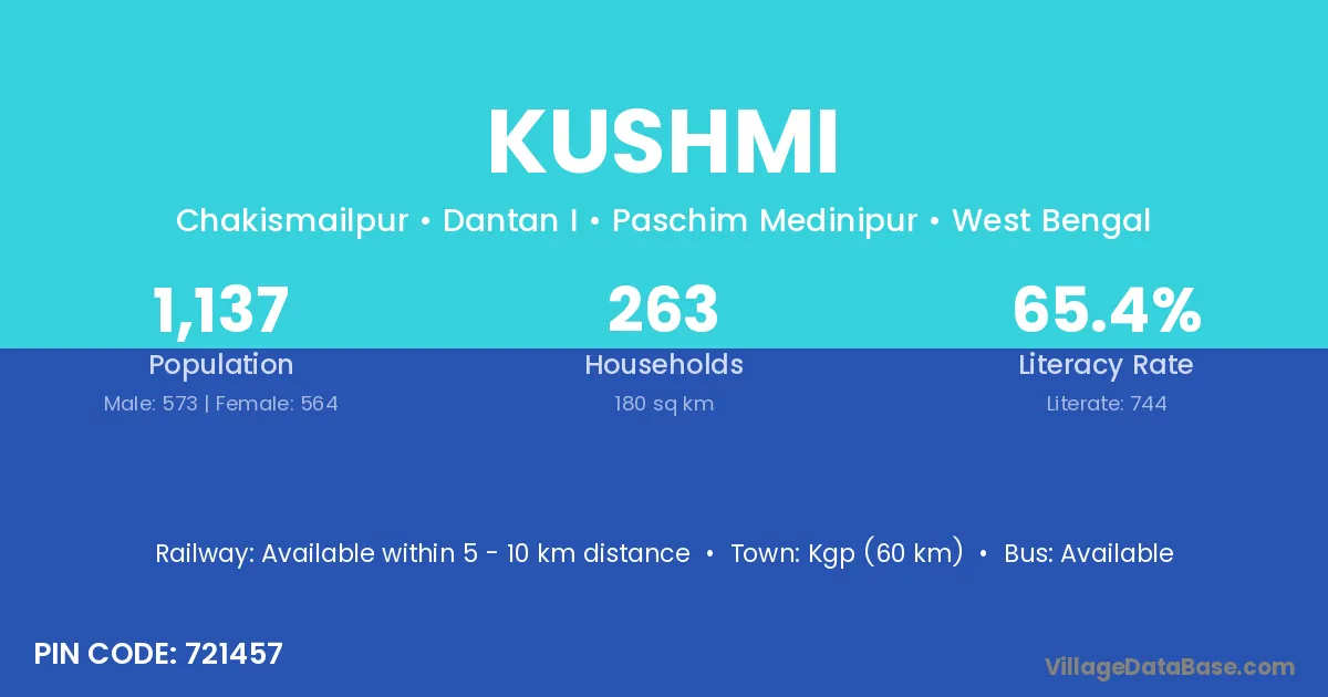 The literacy rate of Kushmi village is 40.43%. Male literacy stands at 46.67% and female literacy at 32.53%.