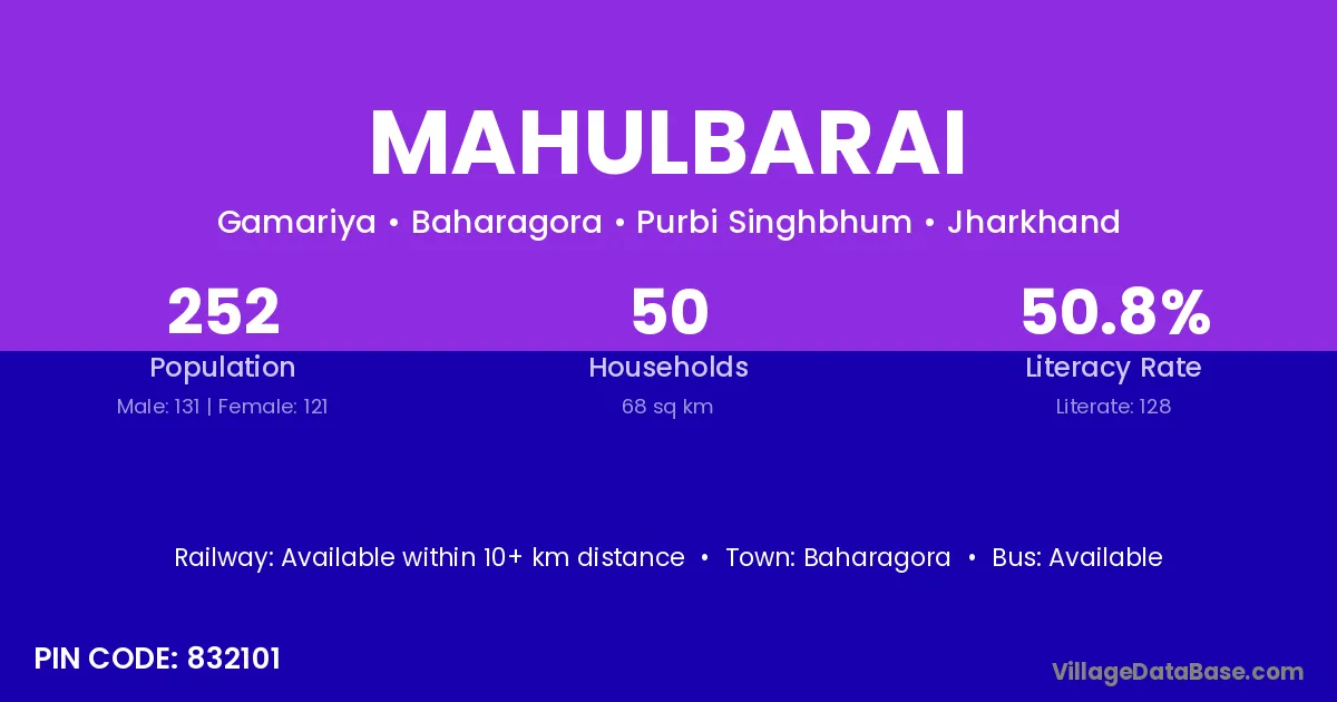 Mahulbarai village has a total population of 252 people, of which 131 are males and 121 are females.
