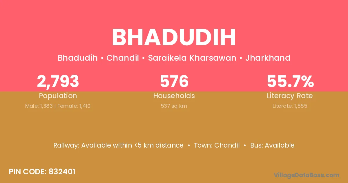 The literacy rate of Bhadudih village is 57.43%. Male literacy stands at 69.57% and female literacy at 46.84%.