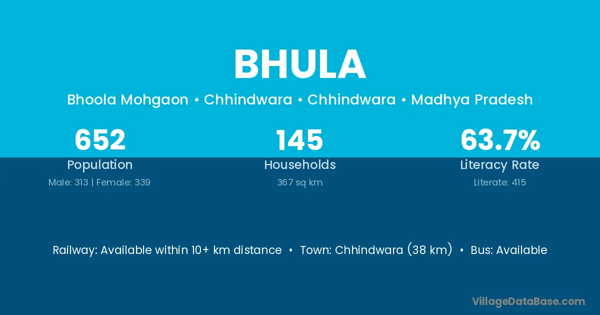 The literacy rate of Bhula village is 55.20%. Male literacy stands at 66.38% and female literacy at 43.79%.