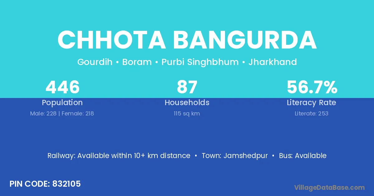 Chhota Bangurda village has a total population of 446 people, of which 228 are males and 218 are females.