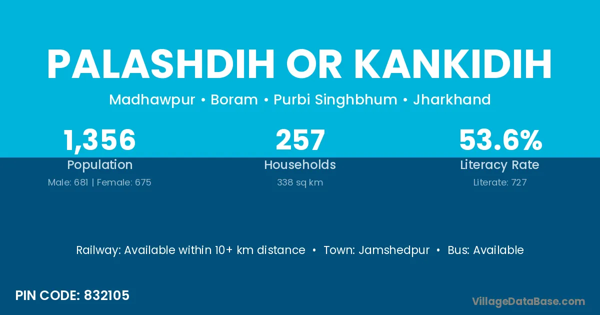 Palashdih Or Kankidih village has a total population of 1,356 people, of which 681 are males and 675 are females.
