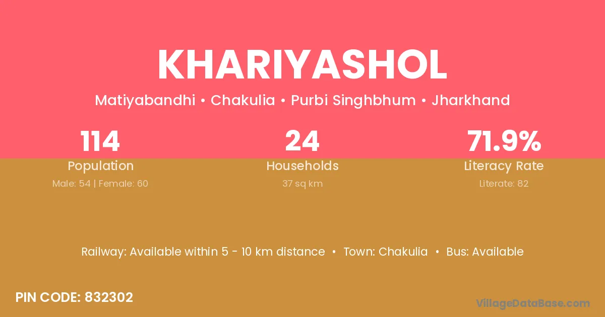 Khariyashol village has a total population of 114 people, of which 54 are males and 60 are females.