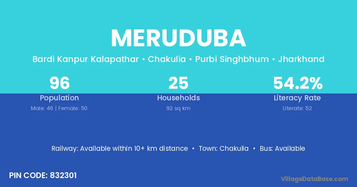 Meruduba village has a total population of 96 people, of which 46 are males and 50 are females.