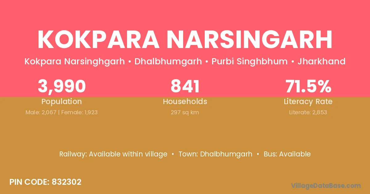 According to Census 2011 information, the village code of Kokpara Narsingarh village is 832302.