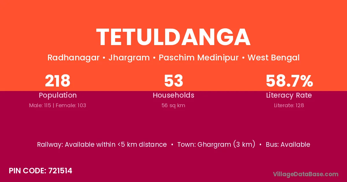 The literacy rate of Tetuldanga village is 57.10%. Male literacy stands at 67.31% and female literacy at 45.65%.