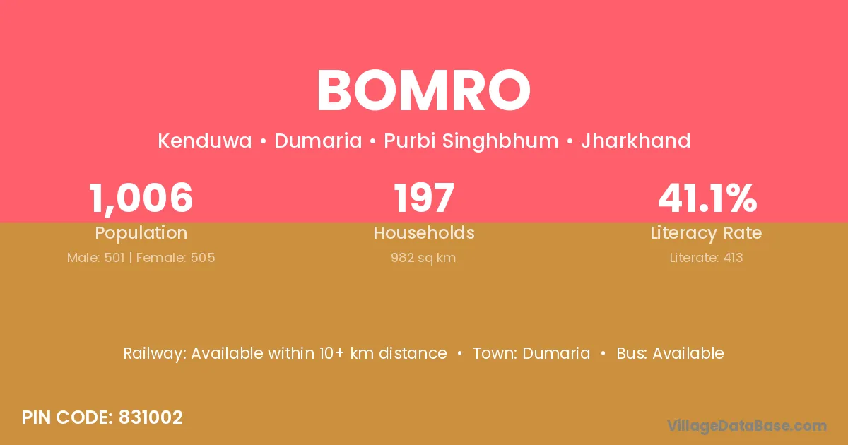 Bomro village has a total population of 1,006 people, of which 501 are males and 505 are females.