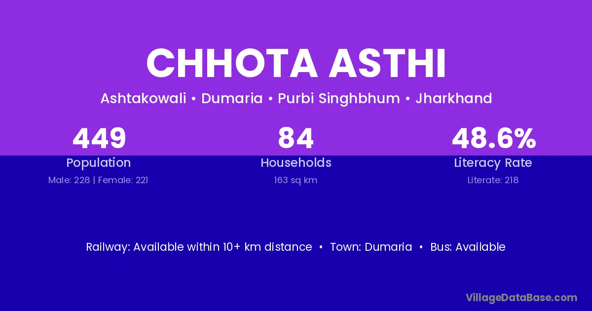 Chhota Asthi village has a total population of 449 people, of which 228 are males and 221 are females.