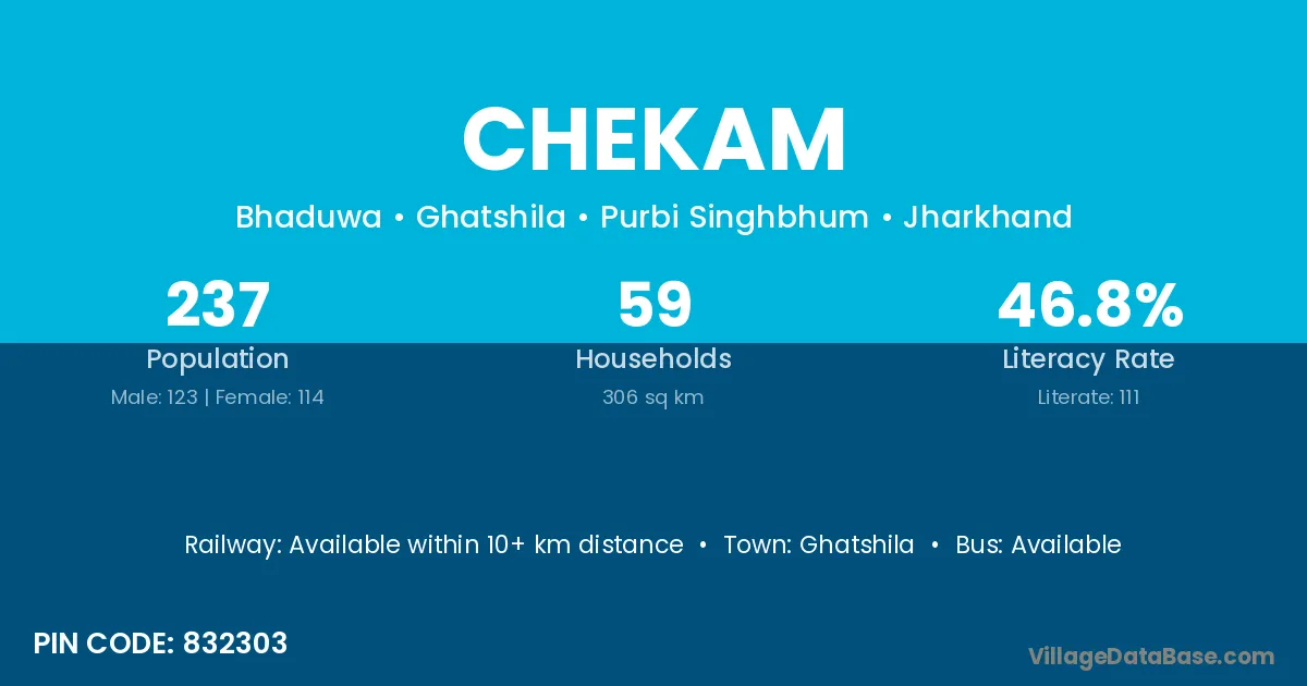 Chekam village has a total population of 237 people, of which 123 are males and 114 are females.
