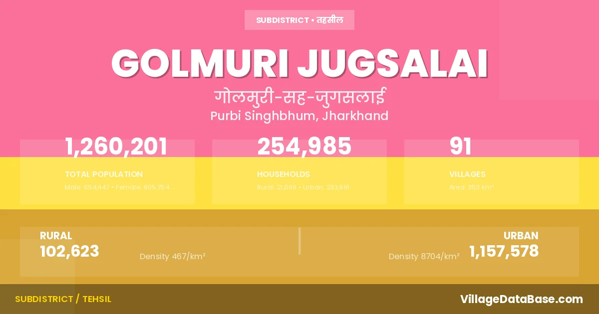 According to the 2011 census The total area of Golmuri Jugsalai Subdivision is 353 km², with a population of 1260201 people. The population density is 3,573 inhabitants per square kilometre, and there are approximately 254985 houses in the sub district.
