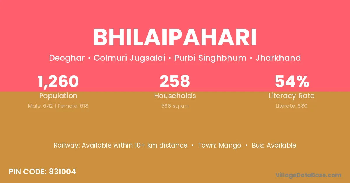 Bhilaipahari village has a total population of 1,260 people, of which 642 are males and 618 are females.
